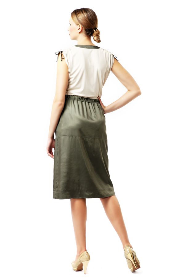 Эксклюзивная модель из новой коллекции Yulia Dushina - летнее платье, сочетающее в крое два вида ткани: лиф платья выполнен из трикотажного полотна молочного цвета, а шелковая юбка - цвета хаки. По плечам сборка со шнурками, на лифе - имитация запашного кроя. Платье отрезное по талии со сборкой и тонкой кулиской, двумя карманами.
