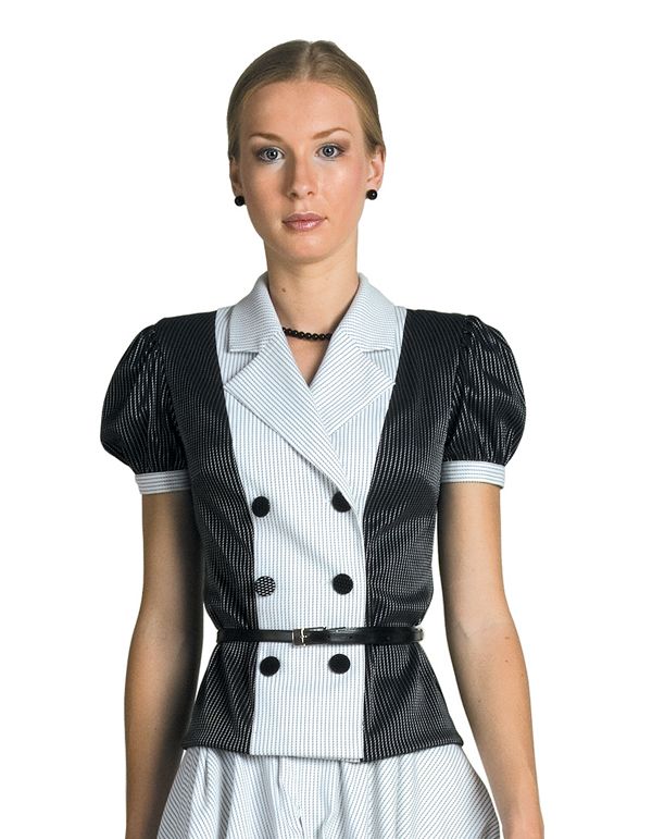 Новинка коллекции Modika - очаровательный жакет с контрастными вставками и изящными рукавами "фонариками", который привнесет особый колорит в деловой гардероб, придаст эффет повседневному костюму и станет прекрасным выбором для торжественных событий. Жакет сочетает черный и белый цвета, ткань имеет пикантный узор в мельчайшую полоску. Застежка жакета - на три пуговицы.