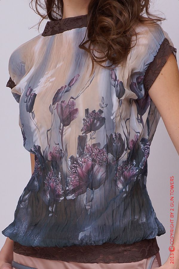 Эксклюзивная модель из новой коллекции творческого дуэта Две Сорванные Башни - блуза из нежного струящегося шифона с цветочным принтом "Стебли какао", особый шарм которой придает легкий эффект "смятости" ткани. Изысканная модель декорирована кружевным кантом по низу и манжетам рукавов, кружевная отделка также подчеркивает элегантность линии выреза горловины "лодочка".