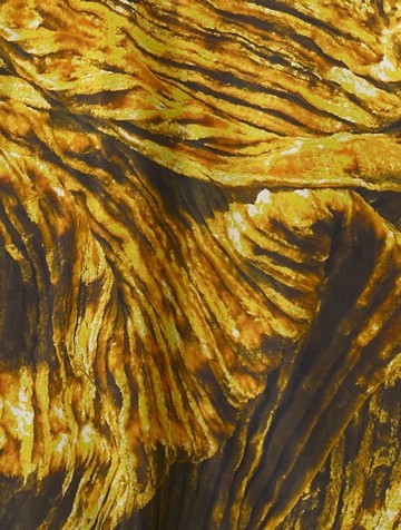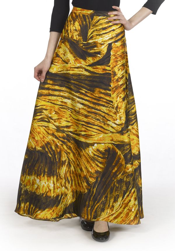 Новинка коллекции бренда ROB-ART - яркая, темпераментая длинная юбка из роскошного шелка. Фасон расклешенной юбки "колокол" исполнен в струяшемся шелке изящного золотистого цвета, который создает фантазийный узор на черном фоне. Элегантно обтягивающая бедра широкая кокетка придает фигуре особую грацию.