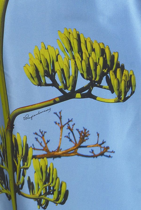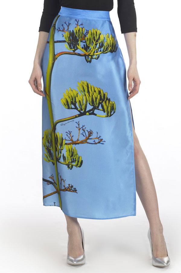 Новинка коллекции бренда ROB-ART - оригинальная юбка запашного кроя, которая имеет сбоку пикантный глубокий вырез. Необычный колоритный принт модели изображает цветующую агаву на нежно-голубом фоне, что придаетм модели необыкновенную красочность и настроение. Модель выполнена из шелка - изящного струящегося материала, который особенно элегантно подчеркивает грацию силуэта. Необыкновенно яркая летняя модель.