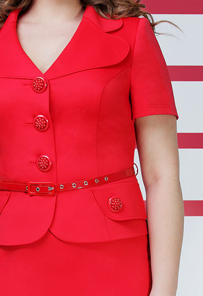 Яркий костюм юбки и укороченного жакета. Широкий фигурный отложной воротник, выразительные листочки карманов, оригинальный декор, созданный пуговицами, изящный короткий рукав - элегантный жакет в этом костюме также эффектно подчеркнут и пояском. Юбка выполнена в прямом крое, состояит из трех горизонтальных "ярусов", которые подчеркивают декоративные строчки.