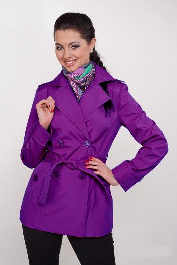 Укороченный двубортный плащ фиолетового цвета - воплощение элегантности классики. Модель имеет застежку на пуговицы, "английский" отложной воротник с выразительными лацканами, боковые прорезные карманы деликатно декорированы пуговицами. Плащ выполнен в свободном крое, приталенный силуэт ему всегда придаст пояс из ткани основы.
