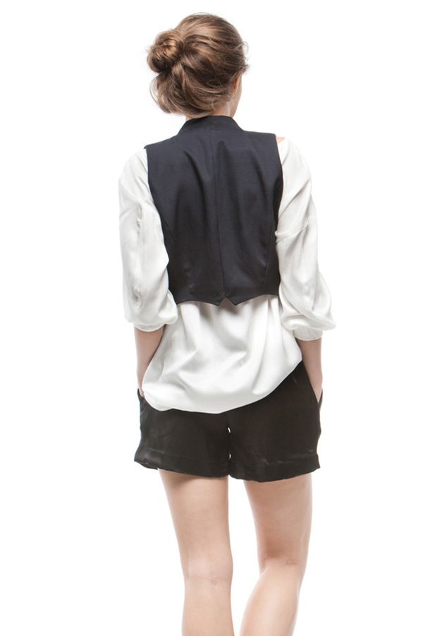 Эксклюзивная модель из новой коллекции Studio Seven – стильный жилет с оригинальной асимметричной линией низа. Спинка модели - укорочена, что в ансамбле с более длинными полочками создает эффектный образ. Жилет имеет выразительный вырез и аккуратный воротничок-стойку, застегивается на роскошные "заклепки".
