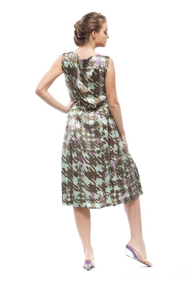 Эксклюзивная модель из новой коллекции Studio Seven – элегантное платье свободного силуэта с подрезными складками по бокам и кулиской по талии. Особый колорит и шарм модели придает изящный струящийся шелк, из которого оно выполнено, а также абстрактный принт, сочетающий бирюзовый и коричневый цвета.