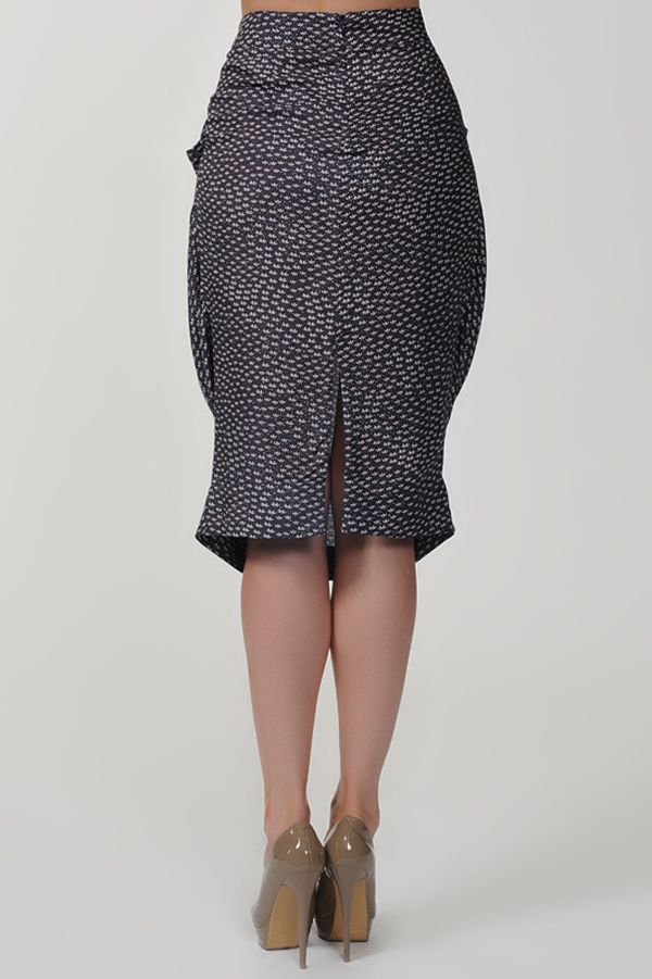 Эксклюзивная модель из новой коллекции Studio Seven – оригинальная юбка с фантазийной драпировкой по переднему полотнищу и выразительными карманами. Особый колорит модели придает рисунок в мелкий цветок, который создает изящный узор на синем основном фоне модели.