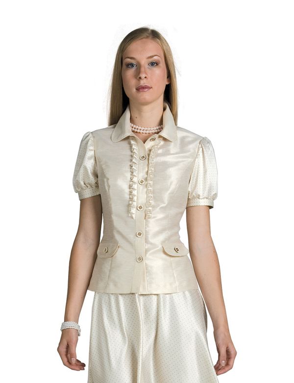 Новинка коллекции Modika - изящный жакет с пикантным декором маленькими рюшами, ниспадающими вниз от воротника по застежке. Утонченность модели придают рукава-фонарики, элегантность - приталенный грациозный силуэт, а маленькую оригинальность - светло-карамельный цвет с легким эффектом "металлик", который выбран в качестве основного, для рукавов же предложен восхитительный, чуть заметный принт в миниатюрный горошек.