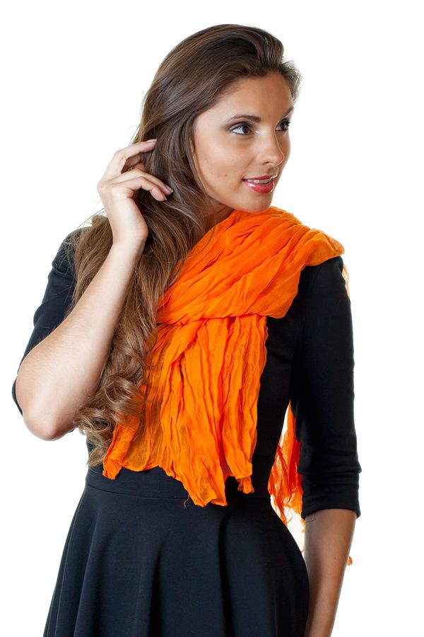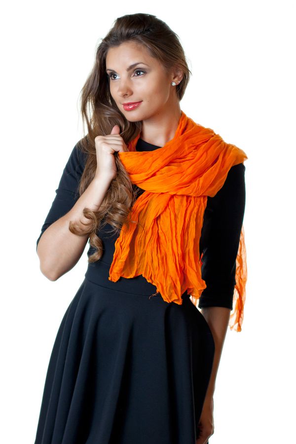 Эффектный легкий платок сочного апельсинового цвета. Шарф-платок - одна из самых модных деталей гардероба, которая придаст любому костюму, или платью особый штрих и колорит. Благодаря достаточной длине, платок позволит создать множество интересных фантазийных композиций и живописных бантов.