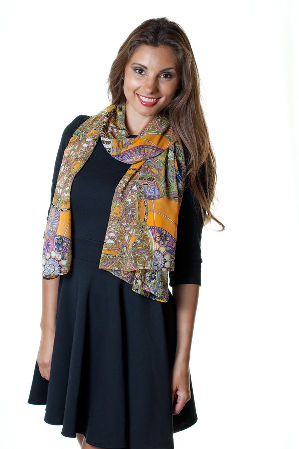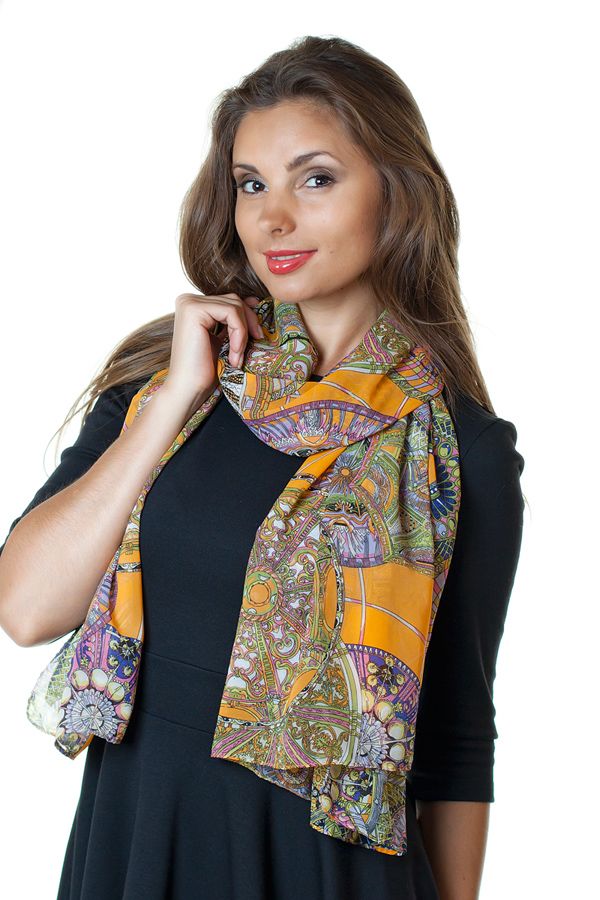 Эффектный легкий платок сочетающий колоритный апельсиновый цвет и изысканный принт с восточными орнаментами. Шарф-платок - одна из самых модных деталей гардероба, которая придаст любому костюму, или платью особый штрих и колорит. Благодаря достаточной длине, платок позволит создать множество интересных фантазийных композиций и живописных бантов.