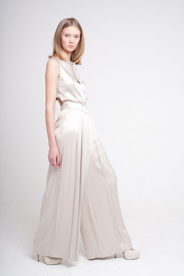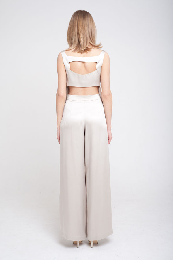 Эксклюзивная модель из новой коллекции Studio Seven – выходной костюм, представляющий ансамбль эффектного топа с "открытой" спинкой и широкими брюками в складку. Силуэт брюк создает образ расклешенной юбки, спереди предусмотрен декор, имитирующий запашной крой.