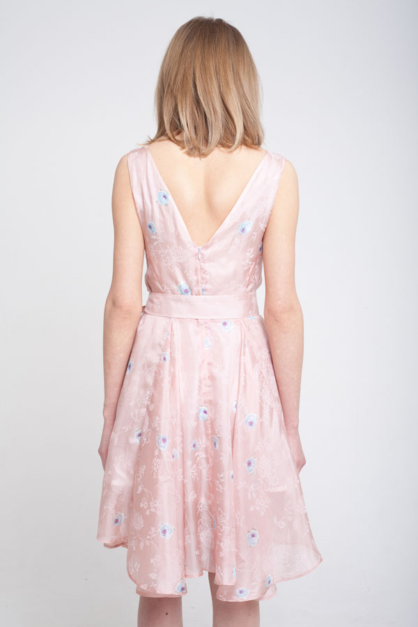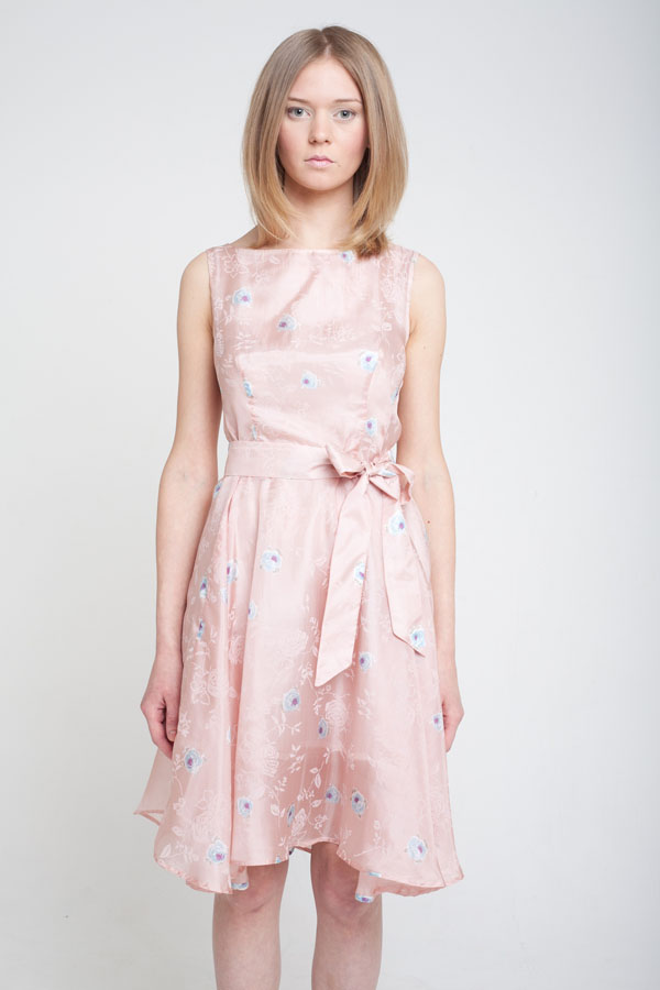 Эксклюзивная модель из новой коллекции Studio Seven – очаровательное коктейльное платье нежного розового цвета в голубой цветок. Платье выполнено из натурального шелка, его буквально "летящий" силуэт особенно подчеркивает фигурная линия среза низа. Линию талии украшает кокетливый пояс-бант. Платье создано из шелка на подкладе из батиста.