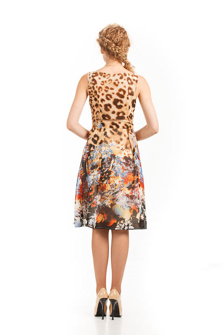 Легкое изящное летнее платье с оригинальным сочетанием леопардового и цветочного принтов. Модель имеет округлый вырез горловины, выполнено в очаровательном приталенном крое, слегка расклешенная юбка мягко струится каскадом волн до линии колен.