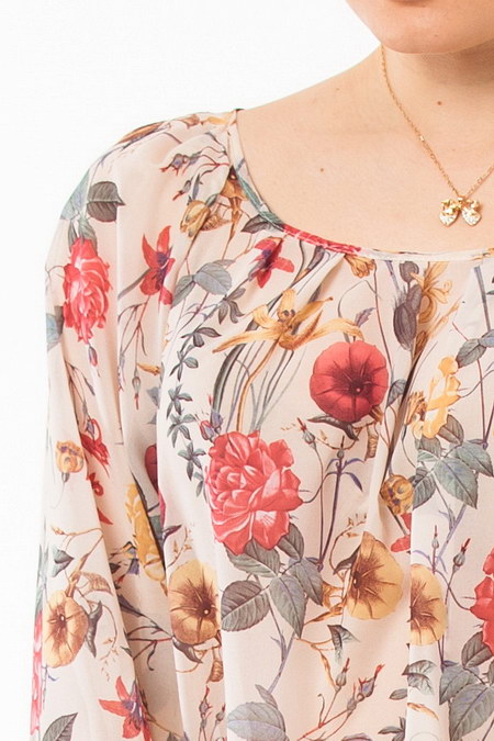Очаровательная блуза с нежным, светлым цветочным принтом. Модель отличается эффектными широкими рукавами, присобранными у тонких манжет изящными складками. Ткань мягко струится от выразительного, глубокого выреза горловины, опускаясь драпировкой-складками до линии бедер, где удерживается на широком канте. Изящная модель для привлекательной леди.