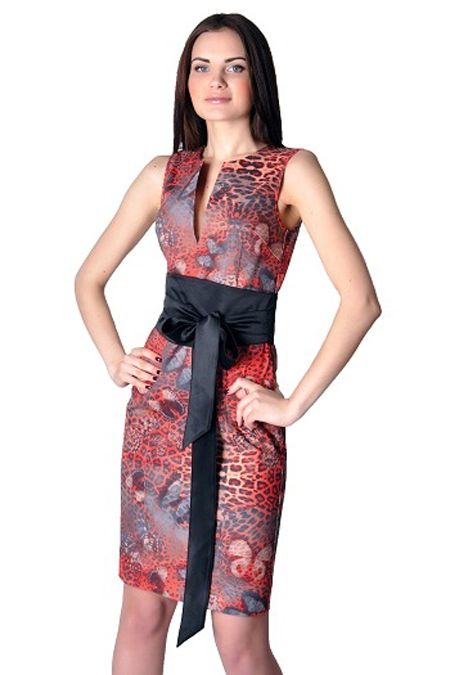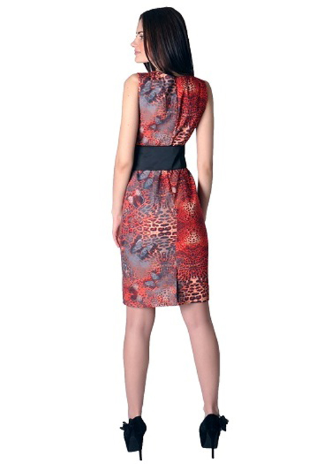 Стильное эффектное платье с выразительным анималистическим принтом, выполненном в красных и графитовых тонах. Приталенный силуэт грациозно подчеркивает пояс-кушак, округлый вырез горловины "декорирован" изящной v-образной "капелькой"... в этом платье лишь несколько ярких "изюминок", но их достаточно, чтобы стать одним из самых эффектных в новом модном гардеробе.