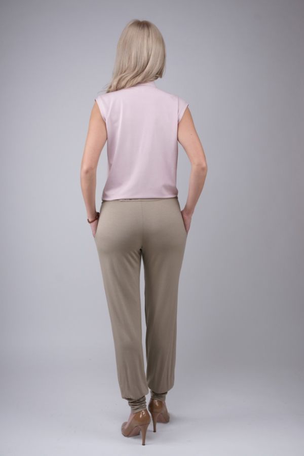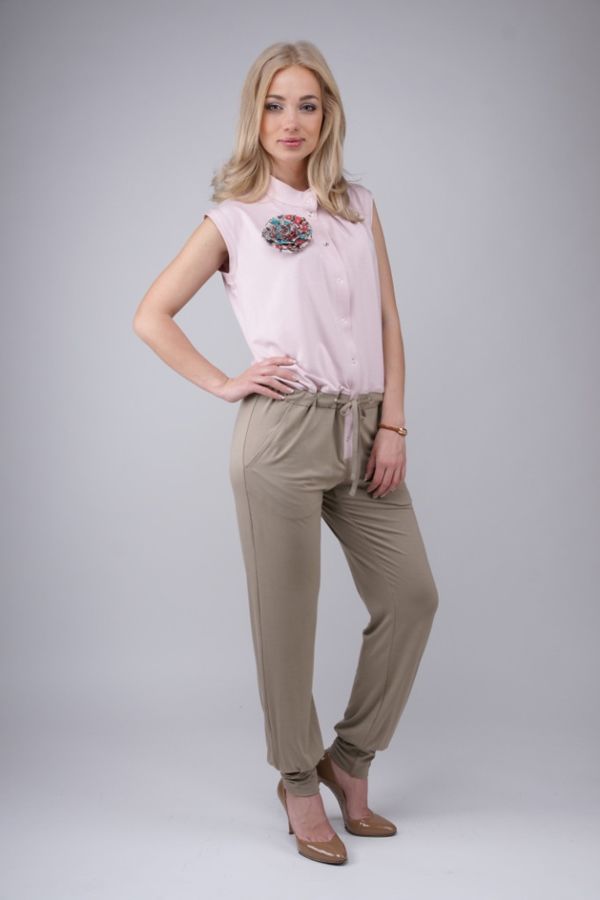 Неординарный и изящный комбинезон из новой коллекции бренда Olga Melukova, который эффектно выполнен в контрастных сочетаних верха и низа. В модели гармонично соединены верх, который создает образ блузона и темно-бежевого цвета низ, которым представлены брюки. Оригинальный комбинезон, создающий эффект брючного ансамбля. Особый шарм и колорит модели придает нежный очаровательный розовый принт "блузона", который декорирован выразительным цветком, пикантная драпировка у выреза горловины, очаровательный воротник-стойка, а также незаурядное исполнение застежки и скрытого пояска, который возможно завязать, как на талии, так и чуть приспустив. Брюки комбинезона отличаются "манжетами" у щиколотки, что придаем образу всей модели особый шик.