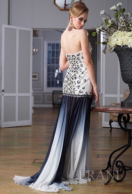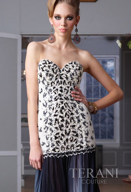 Эксклюзивная модель из новой колекции Terani - эффектное вечернее платье грациозного приталеного силуэта. Женственное декольте, длинная, струящаяся мелкой драпировкой юбка, образующая изысканный шлейф, верх модели, который роскошно вышит бисером, а еще - оригинальный принт под леопарда, выполненный в черно-белых цветах... в этой модели буквально в каждой детали кроя таится своя яркая "изюминка", выражающая эксклюзивность дизайнерской работы.