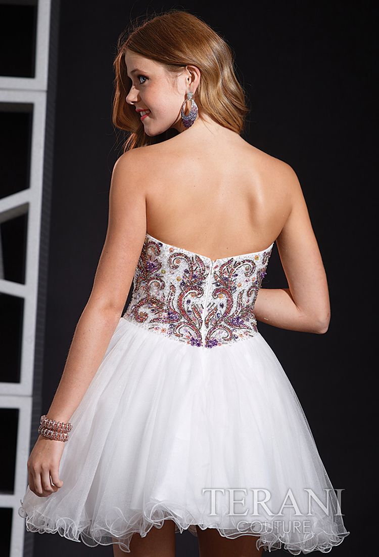 Эксклюзивная модель из новой колекции Terani - изящное платье с очаровательной пышной короткой юбкой и изящным корсетом. Особый шарм и колорит модели придает цвет айвори (слоновой кости) и богатый декор корсета бисером, образующим фантазийный узор. Декор-вышивка выполнена по всему объему корсета. Платье станет изумительным выбором для особых презентаций, выпускного бала, оригинальным вариантом для свадебной церемонии.