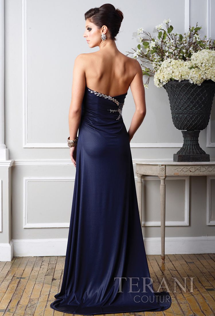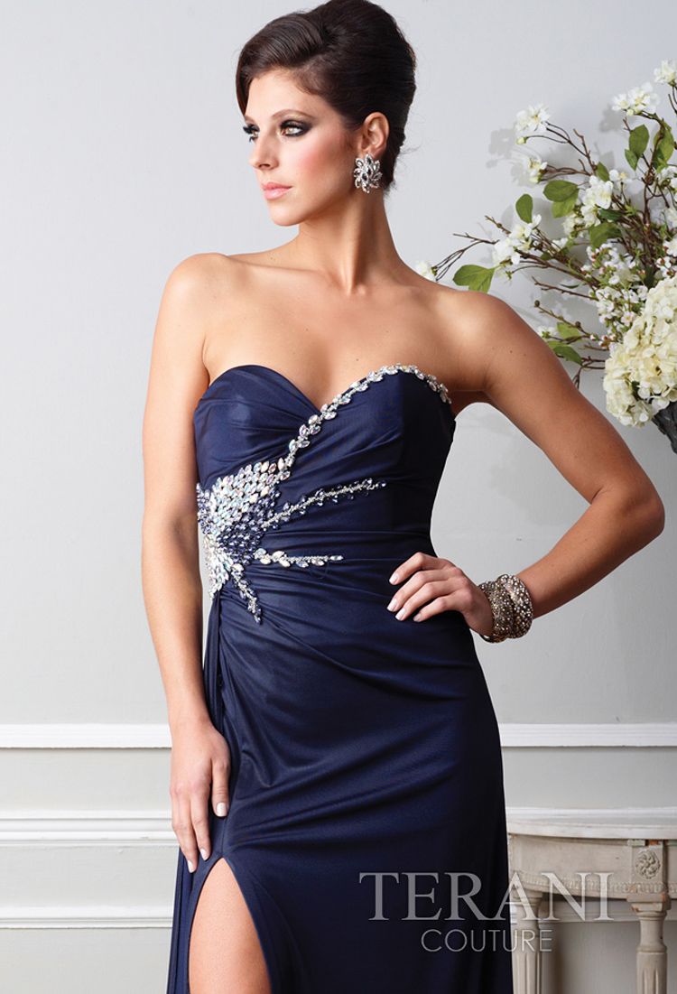 Эксклюзивная модель из новой колекции Terani - элегантное вечернее платье, выполненное в приталенном силуэте, грациозный эффект которого особенно подчеркивает легкая драпировка, струящаяся сбоку по линии талии, а такж изысканный декор - цветочный узор из роскошных стразов, который также тонкой линией укращает декольте. Пикантный разрез спереди сбоку, открытая спинка, выразительное декольте и восхитительный шлейф длинной юбки... в этом платье Ваш выход будет иметь особый эффект.