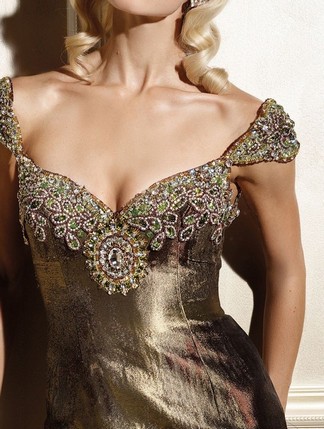 Эксклюзивная модель из новой колекции Terani - изысканное приталенное коктейльное и вечернее платье, выполеннное в изумительном оливковом цвете с эффектом "металлик". Модель отличается роскошной отделкой глубокого декольте и фигурных бретелей вышивкой бисером и стразами. Вышивка образует изящный фантазийный мотив с вкраплением восточных орнаментов.