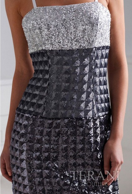 Эксклюзивная модель из новой колекции Terani - стильное платье с оригинальным подбором тканей, представляющийх рельефный геометрический узор "пирамиды". Лиф модели выполнен в контрастном серебристом цвете, который изящно гармонирует с графитовым низом с эффектом "металлик". Платье отличается прямым, чуть приталенным силуэтом, удерживается на изящных тонких бретелях. Платье станет изумительным выбором для особых презентаций, выхода на светский раут.