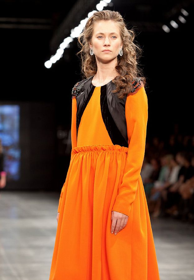 Эксклюзивная модель из коллекции модного Дома Iya Yots – яркое платье с контрастными черными деталями, которые придают особую выразительность оранжевому основному цвету модели. Во вставках, выполненных груди, использованы ткани разных фактур - бархат и шелк, "погоны" роскошно декорированы вышивкой из бисера и стразов.