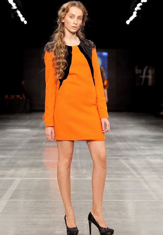 Эксклюзивная модель из коллекции модного Дома Iya Yots – яркое коктейльное платье с контрастными декоративными вставками на груди, которые придают особую выразительность оранжевому основному цвету модели. Во вставках использованы ткани разных фактур - бархат и шелк, "погоны" роскошно декорированы вышивкой из бисера и стразов.