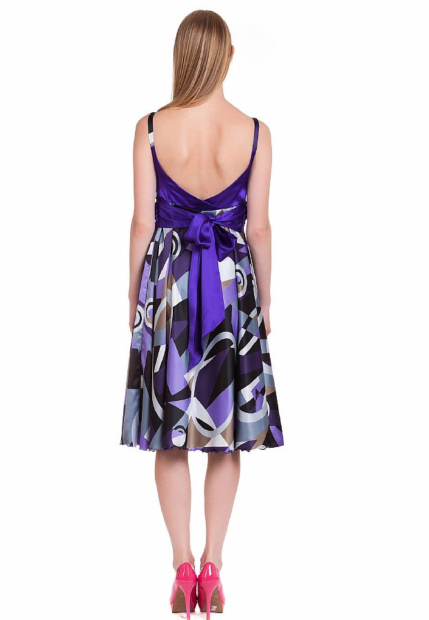 Эксклюзивная модель из коллекции модного Дома Iya Yots – изящное женственное платье с фантазийным абстрактным принтом на струящейся юбке-солнце и декором легкой драпировкой ярко-синего лифа. Лиф на уровне талии завязан лентой в изящный бант, который образуется сзади, украшая глубокий вырез на спинке. Край юбки обработан лентой, что позволяет создать красивую волну, драпировка на груди выполнена из ткани деграде с переливом тонов розового цвета. Узкие бретели выгодно подчеркнут линию плеча.