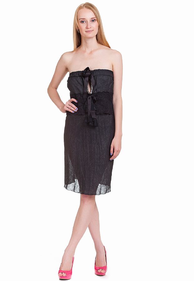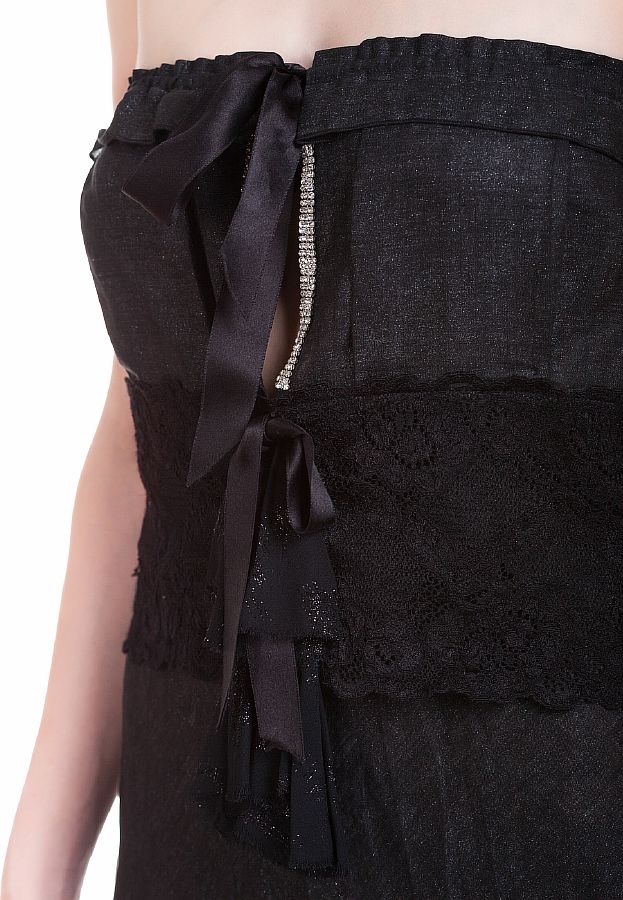 Эксклюзивная модель из коллекции модного Дома Iya Yots – изысканный сарафан из натурального льна с эффектом серебряного напыления. "Корсет", который образует лиф модели, над грудью удерживается при помощи чуть драпированной атласной ленты, пикантный вырез на груди декорирован лентой из страз Swaroski. Особый шарм модели придает и французское кружево фирмы Solstiss, которое использовано для юбки.