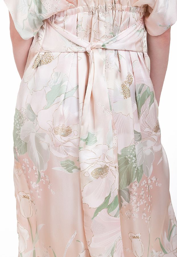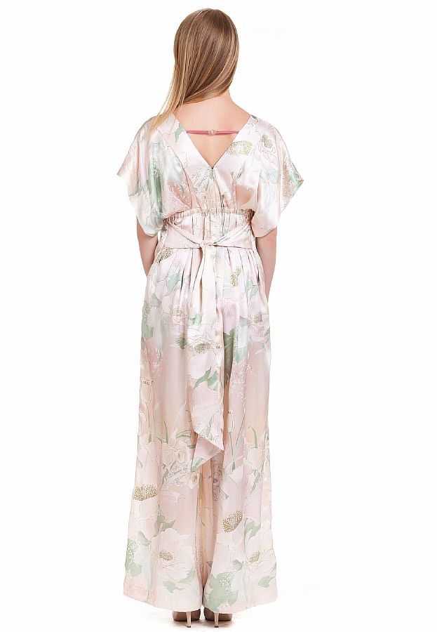 Эксклюзивная модель из коллекции модного Дома Iya Yots – шелковый комбинезон с эксклюзивным авторским цветочным принтом, выполненным в изящных пастельных тонах с легкими золотистыми штрихами. Модель отличается завышенной линией талии, что создает особый акцент на грацию фигуры и особенно - длину и стройность ног. Широкие брюки прямого кроя имеют встречные складки, рукава "кимоно" чуть спущены, имеют присборку на резинку. Комбинезон застегивается на потайную молнию, имеет удобные боковые карманы, глубокий вырез на спине поддерживается бархатной эластичной тесьмой и застегивается брошью с кристаллами Swarovski. Широкий пояс на спинке на линии талии драпируется в бант.