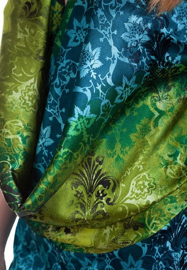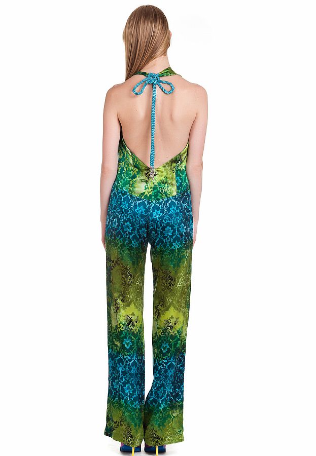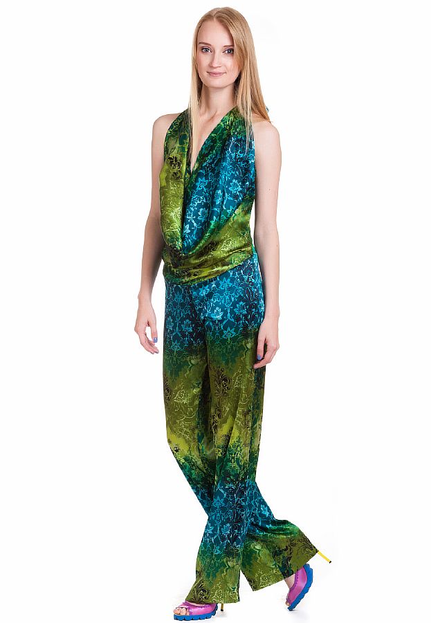 Эксклюзивная модель из коллекции модного Дома Iya Yots – шелковый комбинезон эффектного и выразительного сочетания зеленого и синего цветов, образующих абстрактный принт. Оригинальная и утонченная драпировка "качели" создает удивительный акцент на декольте, глубину которого возможно регулировать, благодаря шелковой ленте-шнурке (на кончиках шнура металлические наконечники со стразами Swarovski), которая завязывается на шее сзади. Модель отличается прямыми облегающими брюками, которые изящно подчеркивают линию бедра. Застежка - потайная "молния".