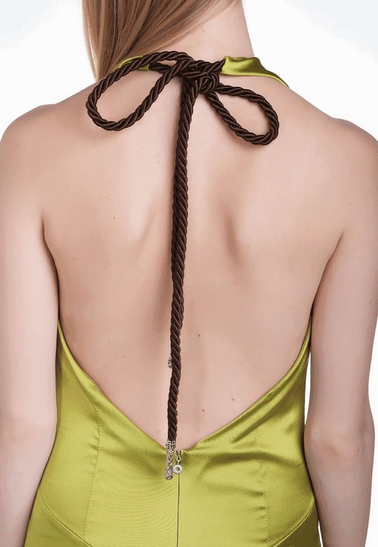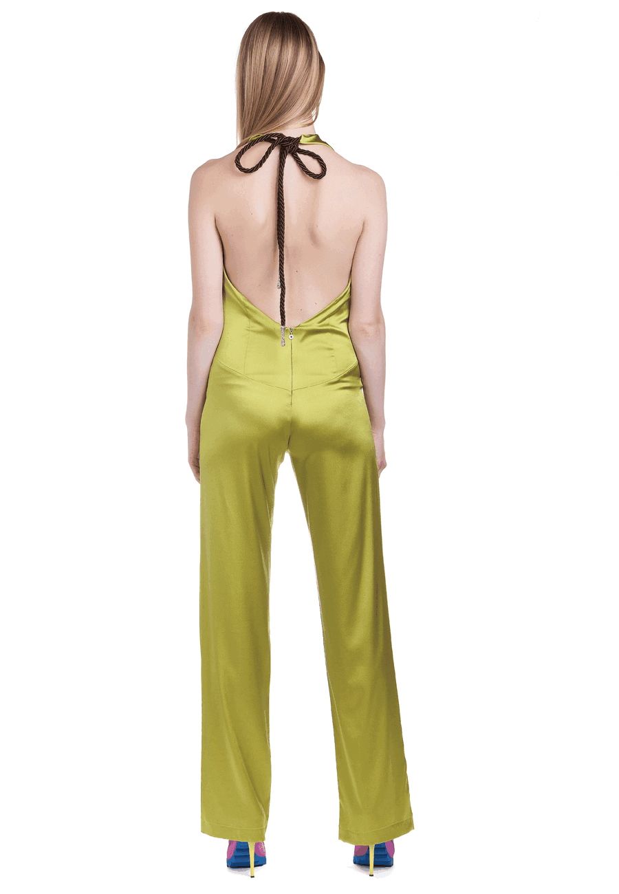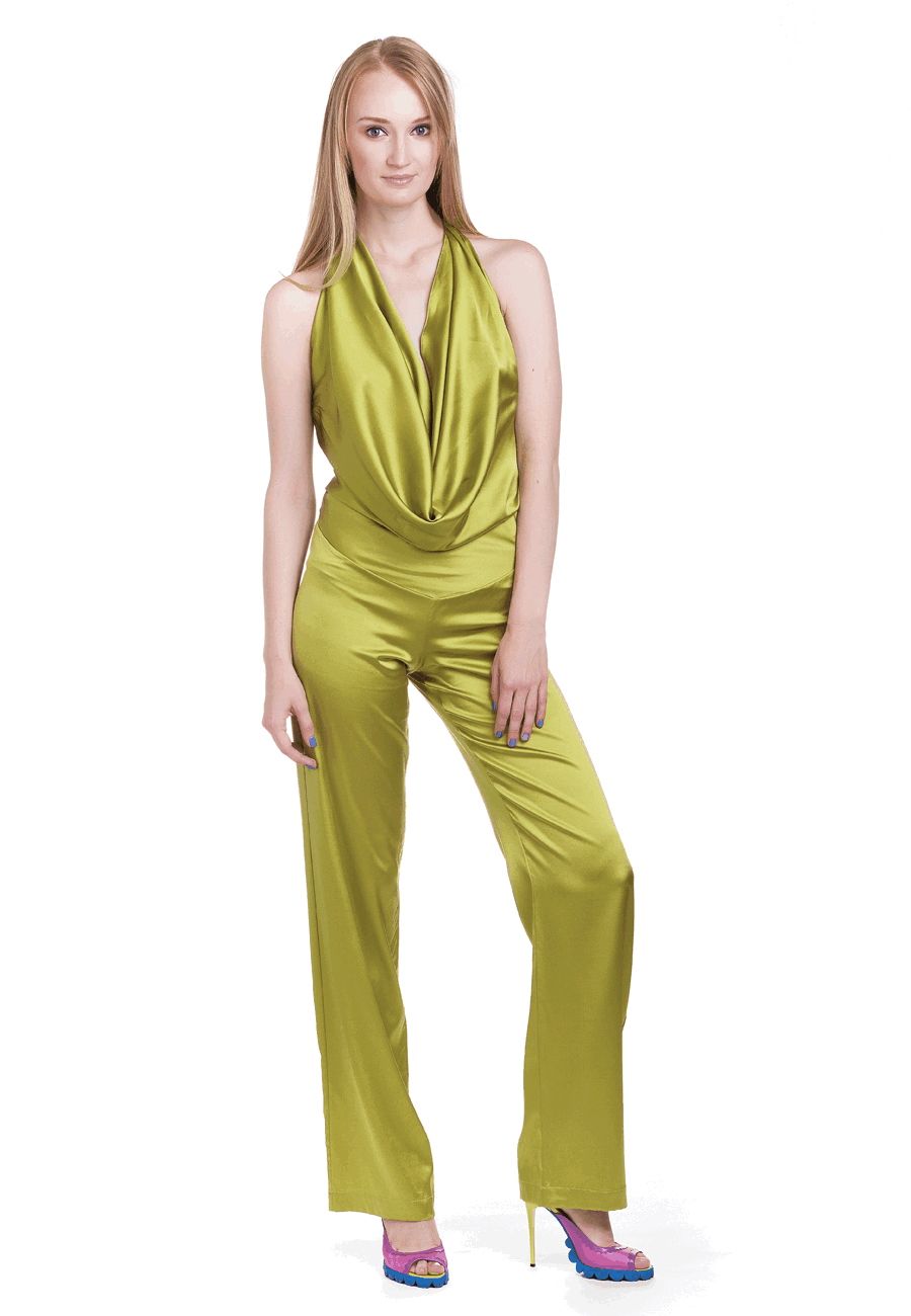 Эксклюзивная модель из коллекции модного Дома Iya Yots – шелковый комбинезон эффектного и выразительного лимонно-оливкового цвет. Оригинальная и утонченная драпировка "качели" создает удивительный акцент на декольте, глубину которого возможно регулировать, благодаря шелковой ленте-шнурке (на кончиках шнура металлические наконечники со стразами Swarovski), которая завязывается на шее сзади. Модель отличается прямыми облегающими брюками, которые изящно подчеркивают линию бедра. Застежка - потайная "молния".