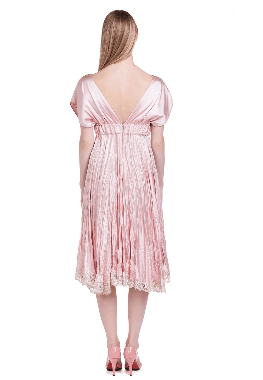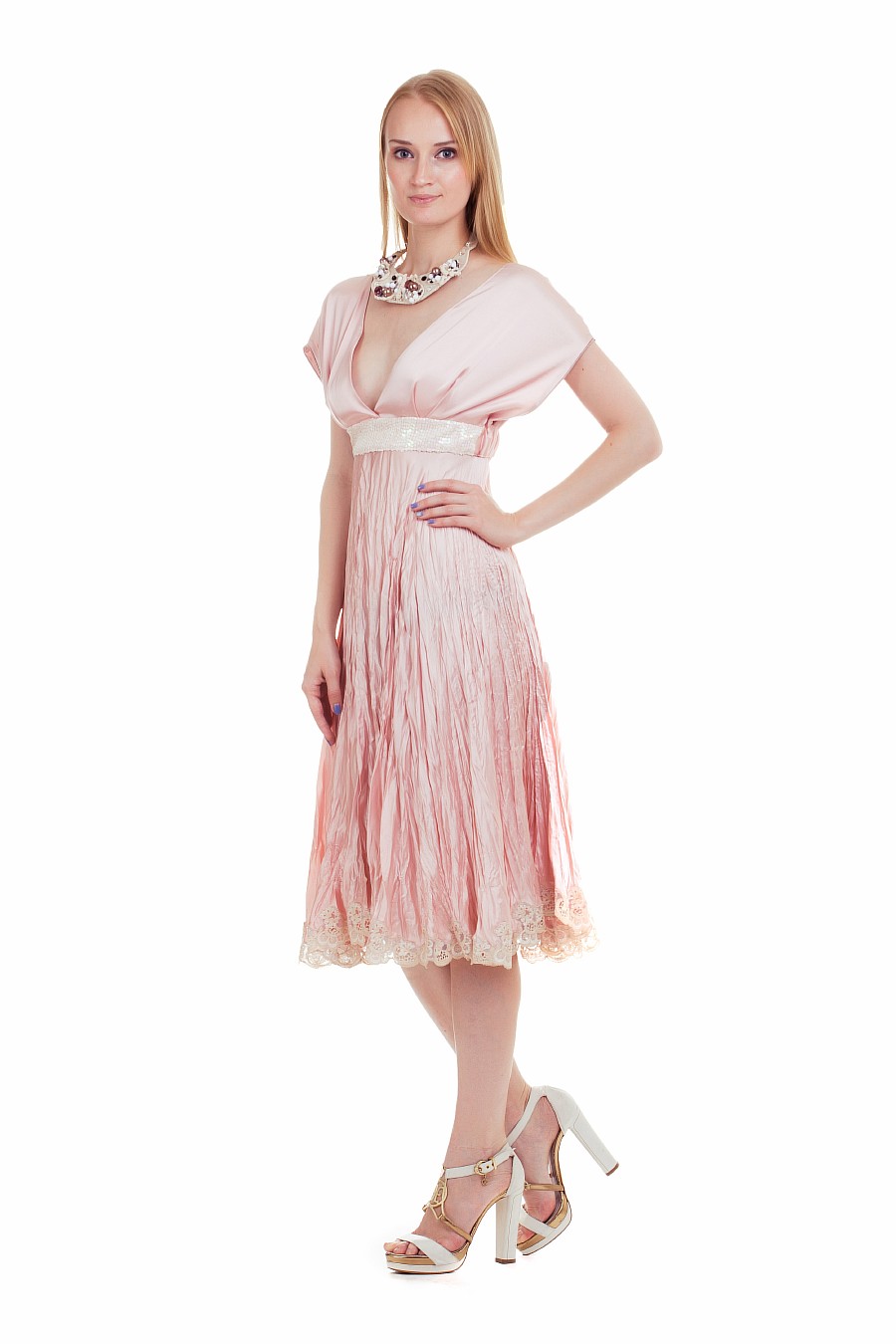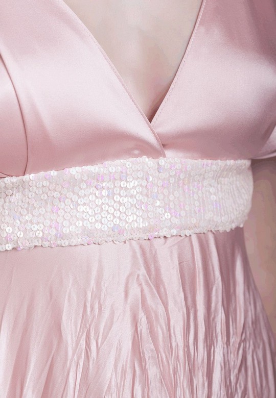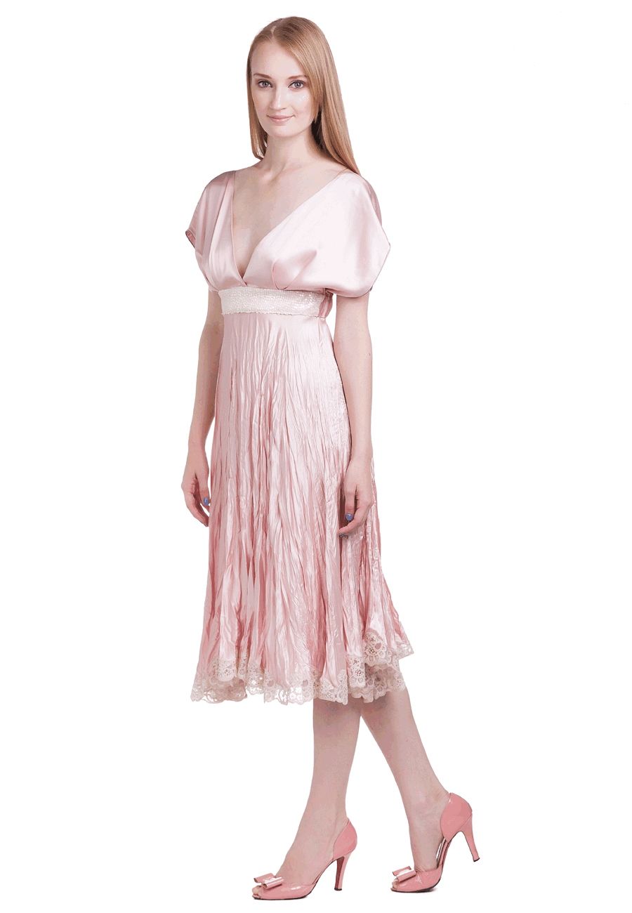 Эксклюзивная модель из коллекции модного Дома Iya Yots – утонченное шелковое вечернее платье, выполненное в нежном розовом цвете. Расклешенная юбка, струящаяся из-под роскошно декорированного пайетками пояса, глубокое декольте и вырез на спине, изящные рукава в стиле "фонарики", а еще - очаровательная отделка низа модели французским кружевом Solstiss... в этом платье сочетается элегантность и женственность.