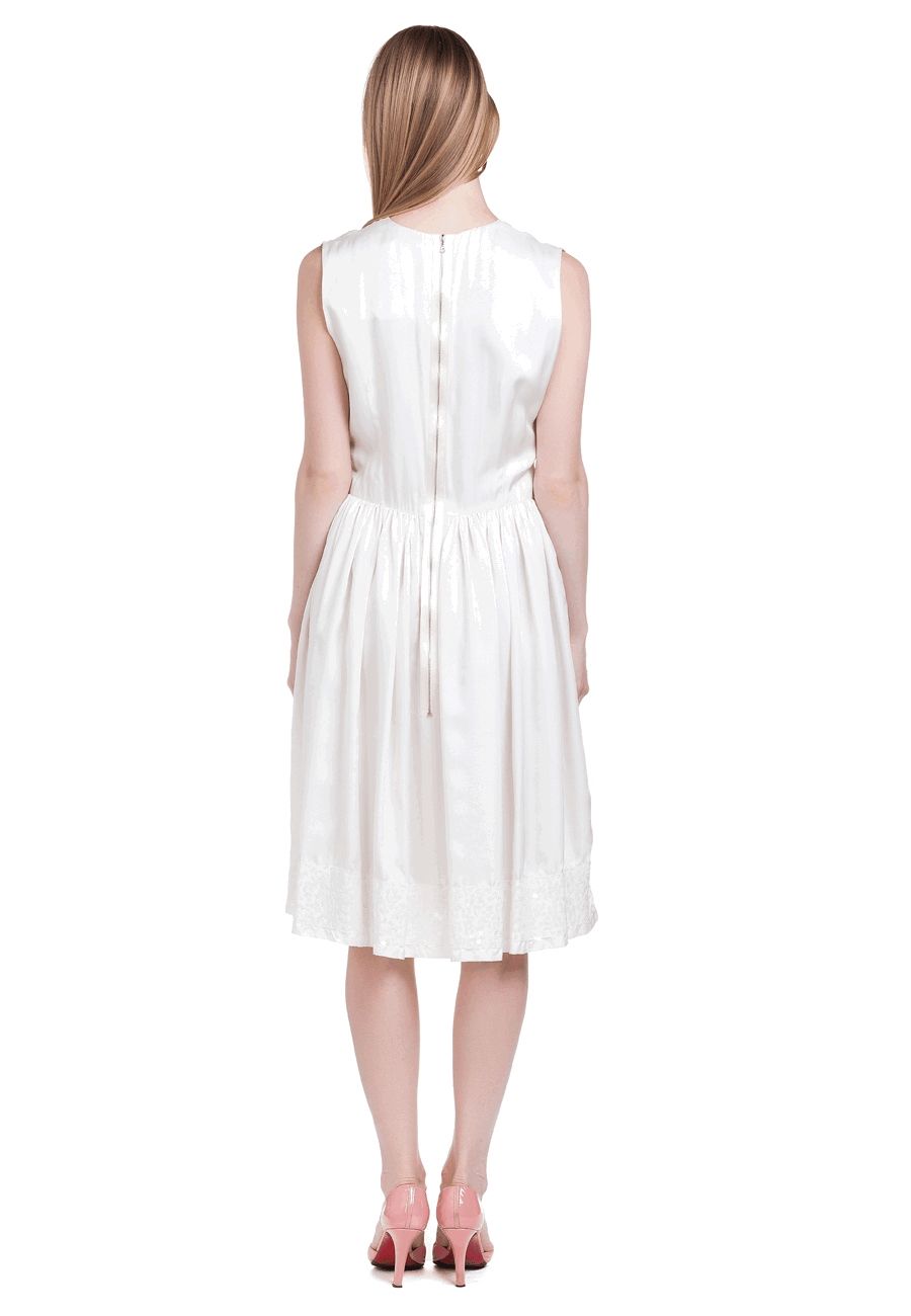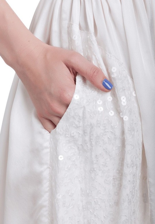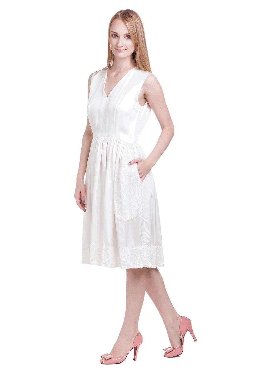 Эксклюзивная модель из коллекции модного Дома Iya Yots – изящное шелковое платье со струящейся расклешенной юбкой и элегантным лифом с v-образным вырезом. Оригинальность этой элегантной модели придает декор пайетками, который выполнен по низу юбки и карманам, расположенным по бокам.