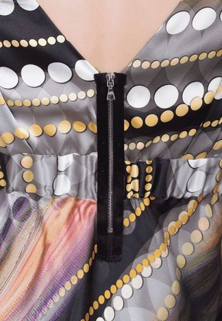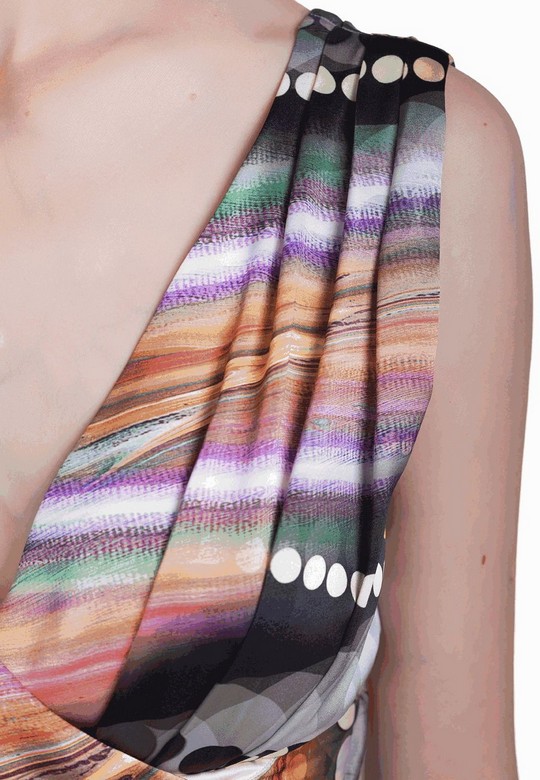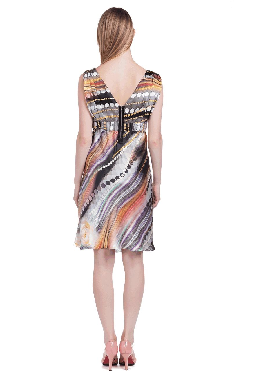 Эксклюзивная модель из коллекции модного Дома Iya Yots – изящное платье, отрезное под линией груди, что придает особый акцент на лиф модели. Лиф, в свою очередь, имеет пикантные драпировки, идущие от линии плеча, которые оригинально сочетаются с "косым" принтом на юбке (скроена по косой). Модель имеет широкий прорезиненный "скрытый" пояс, глубокий v-образный вырез всегда возможно подчеркнуть любимыми украшениями. Платье выполнено из натурального, изысканно струящегося по фигуре шелка. Застежка-молния - на спинке.