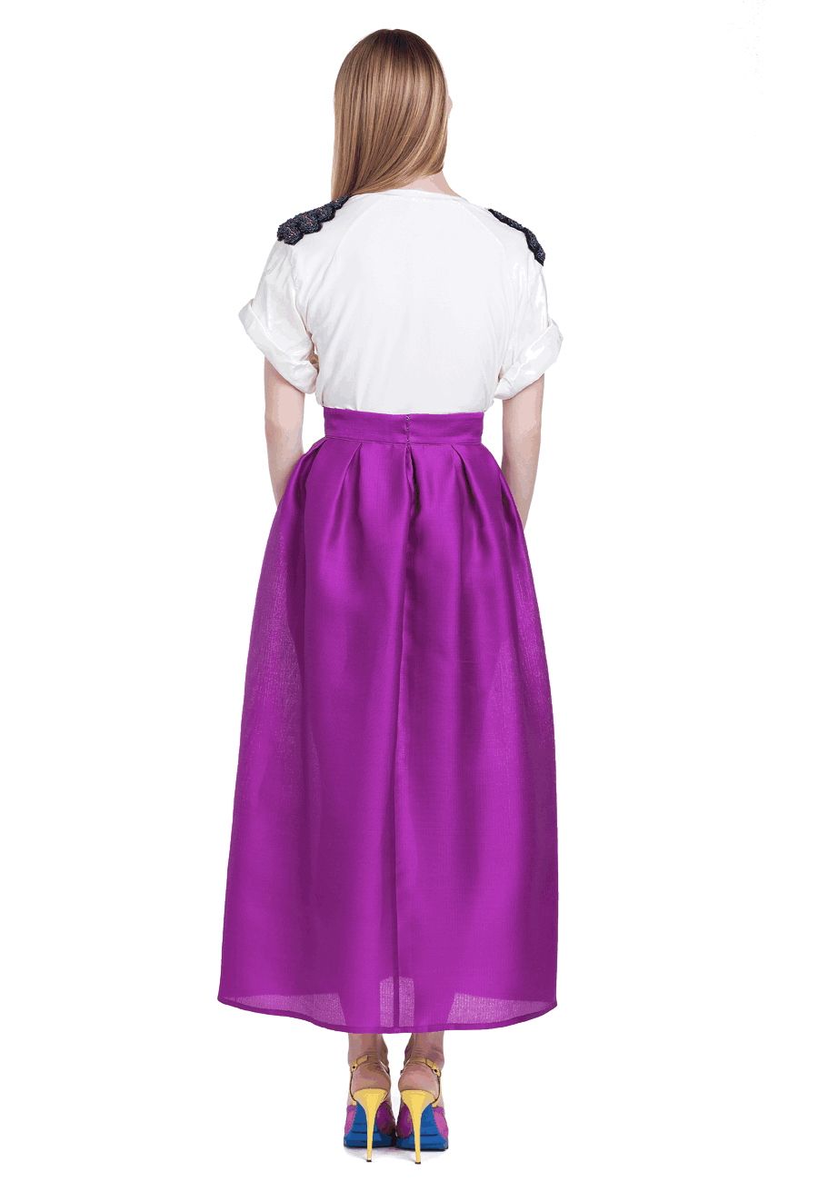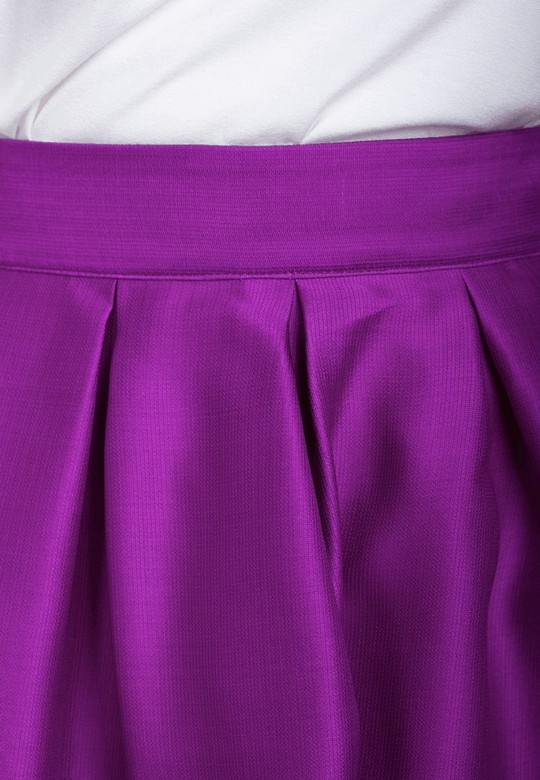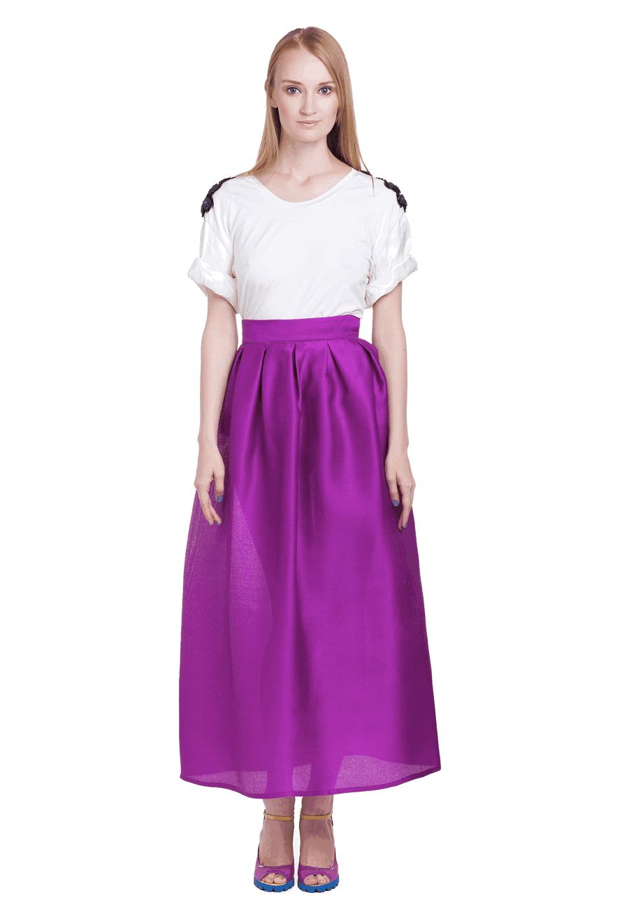 Эксклюзивная модель из коллекции модного Дома Iya Yots – длинная юбка из изысканного плотного шелка чарующе выразительного цвета фуксии. Модель имеет широкий пояс, от которого исходят складки, создающие эффектную объемность, а благодаря особой обработке ткани, юбка не теряет объемную форму. Застежка юбки - кнопки.