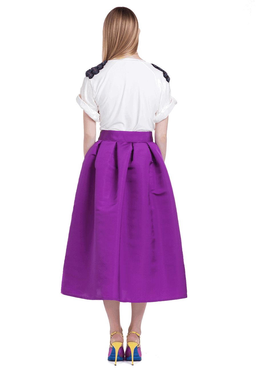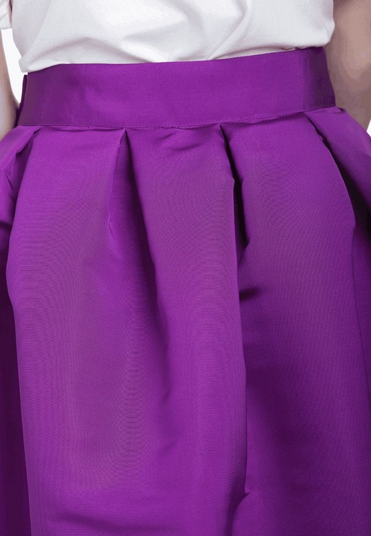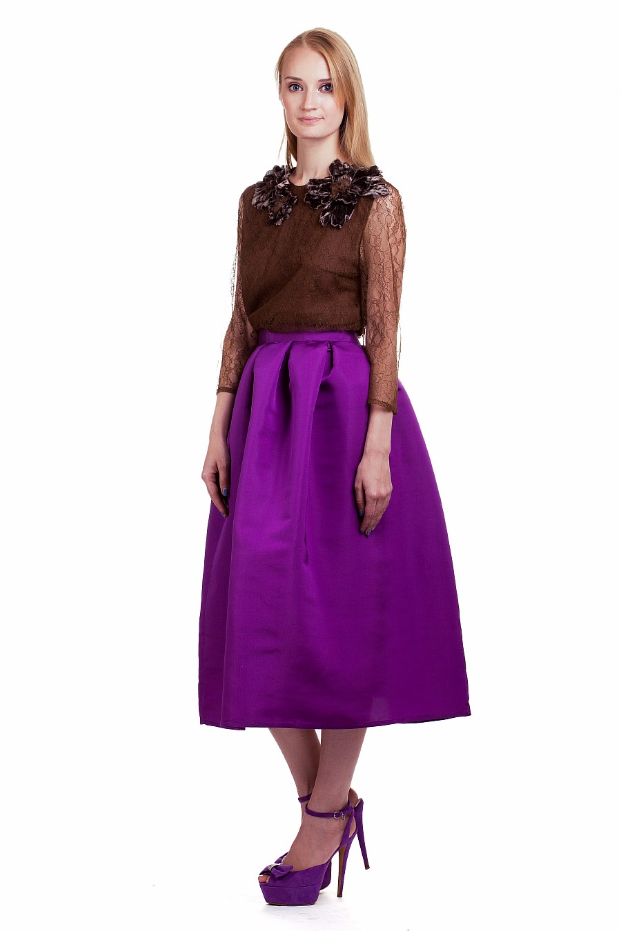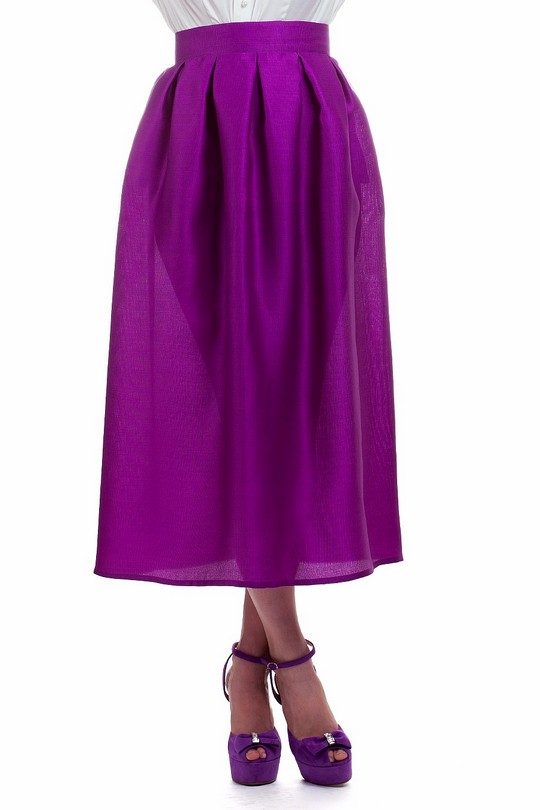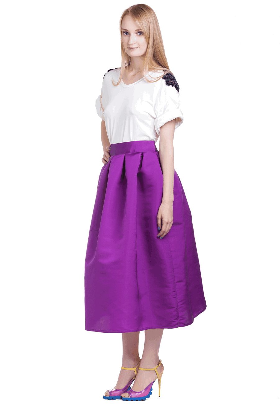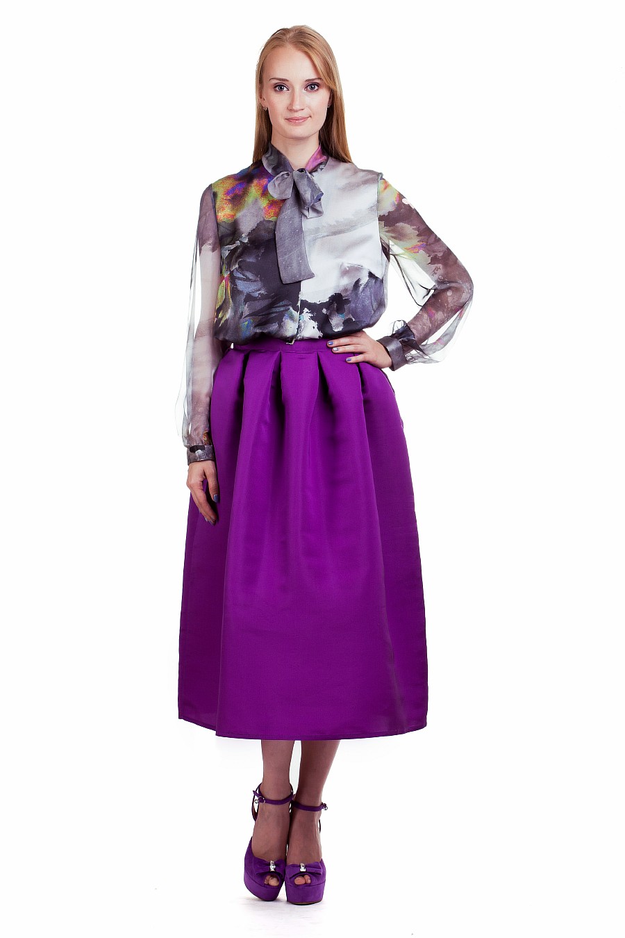 Эксклюзивная модель из коллекции модного Дома Iya Yots – юбка длиной до середины икры, выполненная из изысканного плотного шелка чарующе выразительного цвета фуксии. Модель имеет широкий пояс, от которого исходят складки, создающие эффектную объемность, а благодаря особой обработке ткани, юбка не теряет объемную форму. Застежка юбки - кнопки.