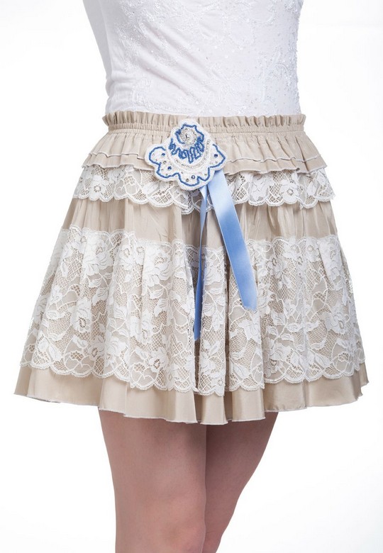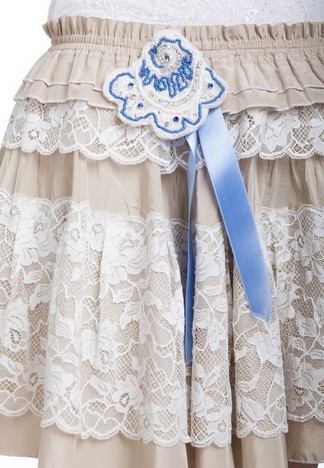 Эксклюзивная модель из коллекции модного Дома Iya Yots – элегантная и кокетливая юбка с очаровательным ажурным декором французским кружевом Solstiss, который выполнен в виде драпированных воланов по всему объему модели. Юбка сочетает утонченные светлые цвета, спереди украшена шелковой лентой и цветком голубого цвета.