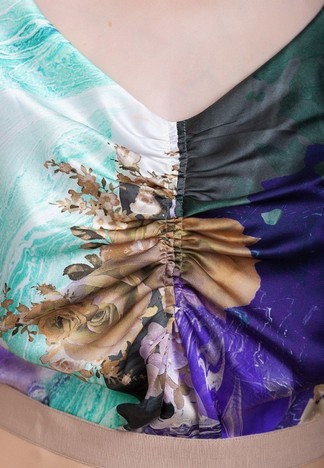 Эксклюзивная модель из коллекции модного Дома Iya Yots – шелковая блуза с эффектным цветочным принтом, сочетающим синий, кофейный и белый цвета. Модель отличается изящной драпировкой, которая создает особый утонченный образ глубокому v-образному вырезу. Блуза станет прекрасным дополнением к повседневному костюму, станет яркой деталью ансамбля для особого выхода.