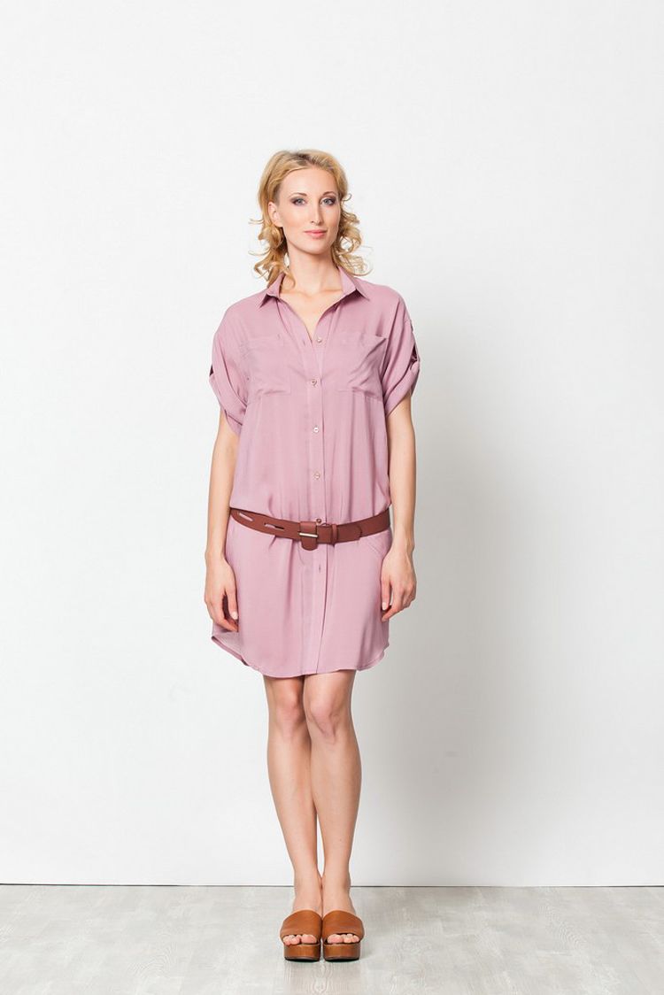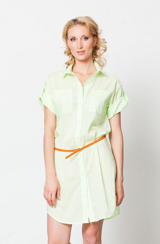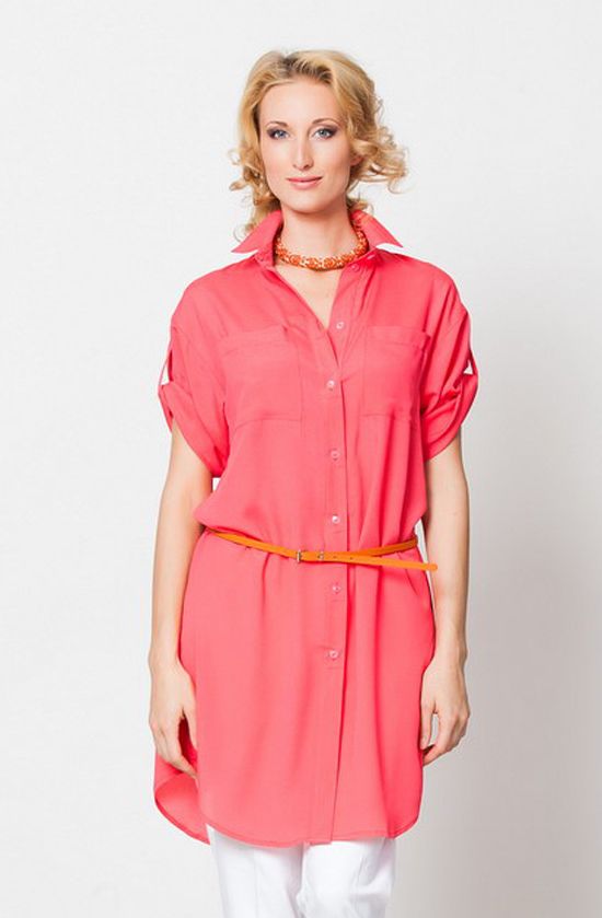 Модель из новой коллекции Лады Калининой – удлиненная блузка, выполненная в модном рубашечном крое, который придает ее свободному классическому силуэту молодежный спортивный стиль. Модель подчеркнута пояском, благодаря чему возможно варьировать с фасоном блузки, придав ей приталенный изящный образ, или подчеркнуть линию бедер. Блузка отличается оригинальным кроем рукавов, которые эффектно "подхвачены" тесьмой, что образует объемный манжет, имеет воротник-стойку, накладные карманы на линии груди, застежка - на пуговицы спереди по всей длине модели. Модель представлена в нескольких вариациях нежных, и в то же время выразительных пастельных цветов. Модели отличны и по размерам: сиреневая блузка в размерах 42-50; малиново-коралловая 44, 46; нежно-салатовая и светло-лимонная 44-48; светло-лимонная