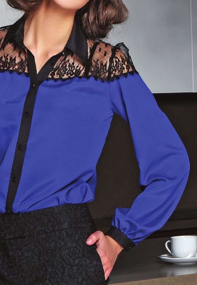 Эксклюзивная модель из новой коллекции итальянского брэнда Dino Chizari - изящная блуза из яркого ультрамаринового крепдешина, очарование и яркий шарм которой придает исполнение кокетки из роскошного черного кружева, а также эффектные широкие рукава, изящно присборенные у манжет, отделка контрастной черной лентой манжетов рукавов, воротника, планки застежки. Элегантная и выразительная модель составит неповторимый ансамбль в деловом костюме, придаст особый шарм костюму для торжества.