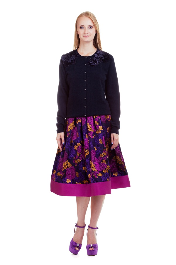 Юбка миди А-образного силуэта из плотного жаккарда, по низу декорирована утяжеляющей отделкой в виде двойной ленты из шёлка.