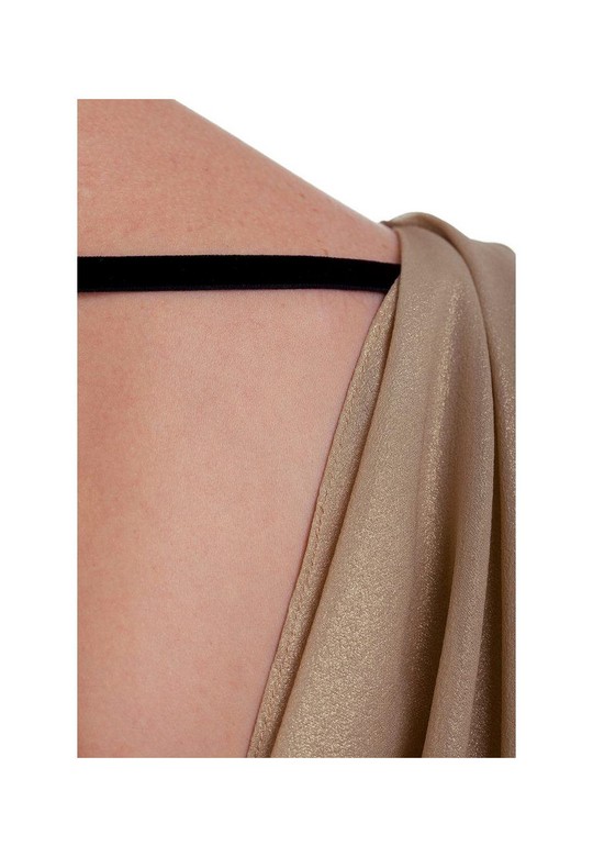 Вырез кроя "качели" изысканно обнажает спину. Юбка, посажена на резинку, что позволяет варьировать длину платья. Подъюбник из плотного эластичного атласа короче основной длины на 20 см.; глубокий вырез на спине поддерживается бархатной эластичной тесьмой.