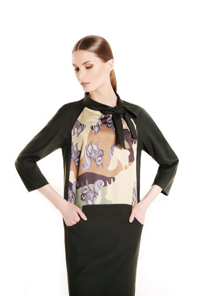 Платье из джерси комбинируется с принтованной тканью. Принт,белка с орехом в лапках, на фоне камуфляжа - символ бренда Victoria Andreyanova, . Воротник-стойка с завязками. Для творческих людей и всех любителей белок.