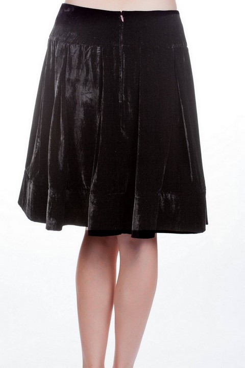 Модель с глубокими "бантовыми" складками, низ юбки "утяжелен" двойным плотным манжетом. Классический А-образный силуэт подходит для любых типов фигур, зрительно стройнит талию.