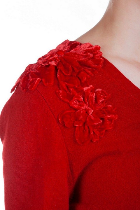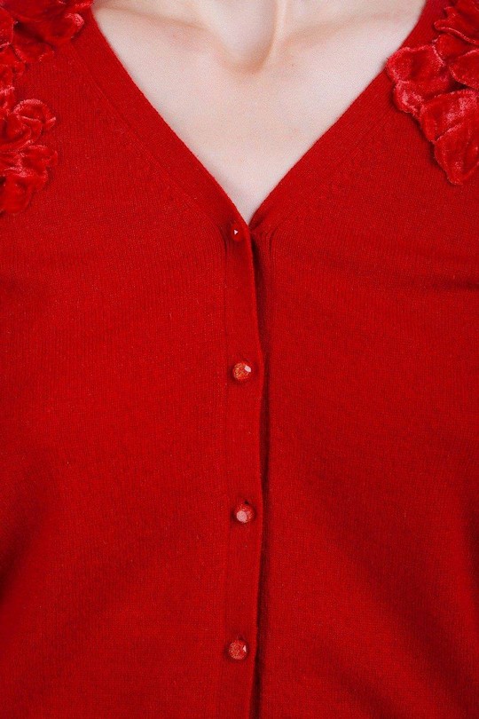 Модель полуприлегающего силуэта, с V-вырезом, застёгивается на пуговицы в тон изделия. Плечи кардигана украшены бархатными цветами ручной работы. Манжеты и низ изделия на вязаных манжетах. Этот дизайнрский кардигает идеально сочетается с шёлковыми блузами и вечерними платьями
