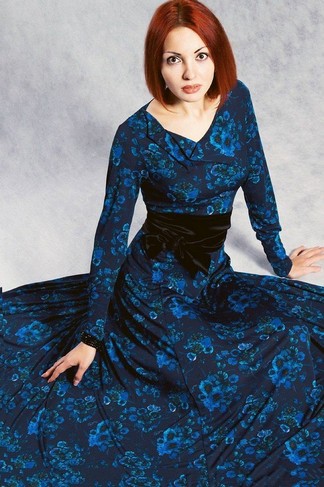 Длинное платье из тонкого струящегося трикотажа с цветочным узором предпочтут женщины романтического типа. Все платье усыпано фиалками, окрашенными множеством оттенков синего: от ультрамаринового и лазурно-синего до сапфирового и пурпурно-синего. Ворот платья обрамляют две жесткие асимметричные складки, делая платье еще более стильным и запоминающимся. Это платье может быть дополнено широким черным атласным поясом, что подчеркнет талию и сделает её ещё более изящной и стройной.