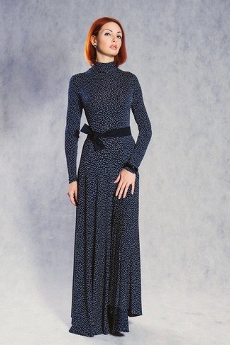 Длинное, расклешенное книзу платье темно-синего цвета в мелкий горох сшито из эластичного вискозного трикотажа. Сверху платье выглядит простым и строгим, благодаря тщательно продуманному дизайну, напоминая обычную водолазку. От талии платье максимально расклешается за счет использования диагонального кроя, благодаря чему платье максимально облегает фигуру. Дополнительной стильности платью придаёт объёмный отстёгивающийся возле воротника-стойки цветок из чёрного газа и широкий атласный черный пояс-бант. Также платье можно носить без пояса и цветка
