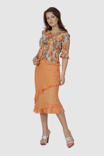 Легкий женский костюм с однотонной оранжевой юбкой с оборкой и в тон ей разноцветной блузой