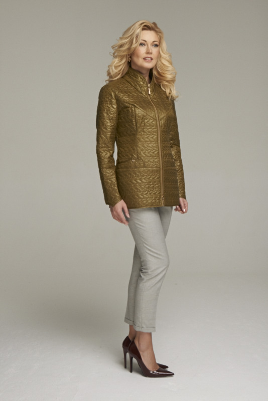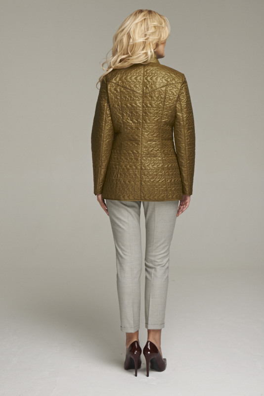 Жакет из стеганного двухстороннего полотна, прилегающего силуэта с застежкой на молнию цвета розовое золото. Карманы в швах с декоративной листочкой, украшенной металлической фурнитурой. Геометрическая форма кокеток полочек и спинки имеет одинаковую конфигурацию с низом рукава. Длина по спинке 70 см., длина рукава 62 см