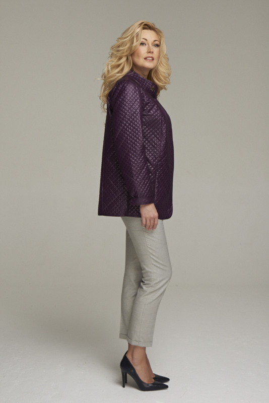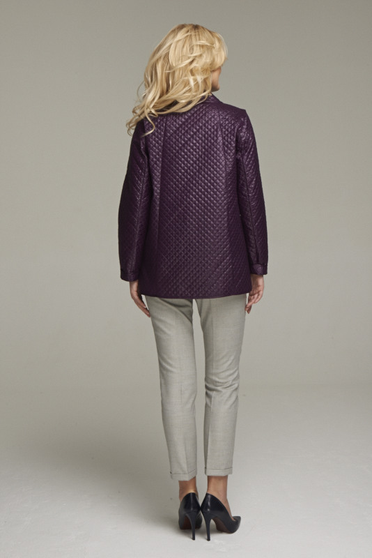Жакет из стеганного двухстороннего полотна, свободного кроя с застежкой на скрытую молнию. Воротник стойка украшает бабочка цвета розовое золото. Удобные карманы расположены в вертикальных рельефах. Длина по спинке 70 см., длина рукава 64 см.